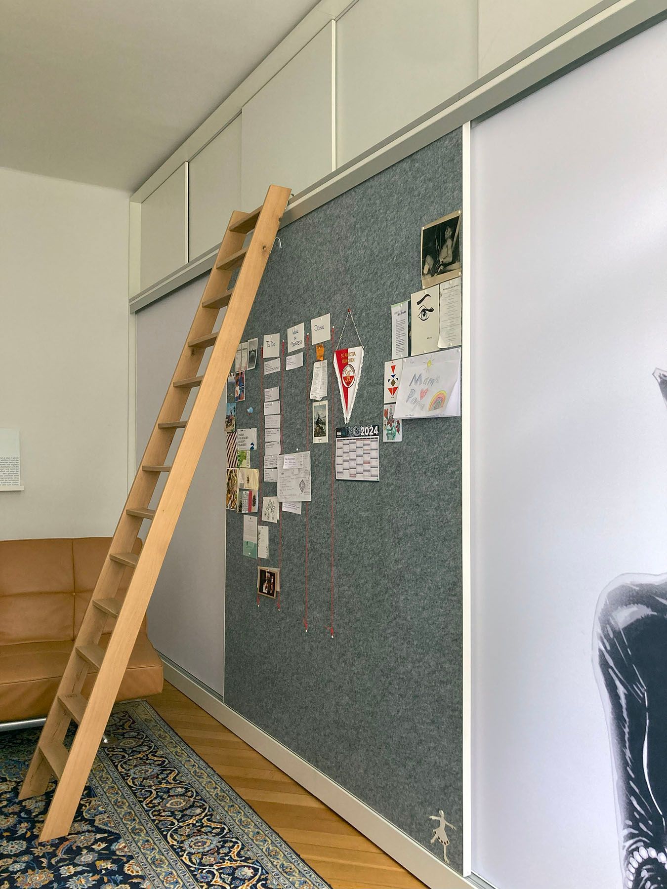 Die 5,5 m lange und 3,4 m hohe Wand ist komplett bespielt, so dass sich die Schränke optimal in den Raum einfügen, ohne wuchtig zu wirken. Die Schiebetüren sind elegant, praktisch und ebenfalls platzsparend, weil nicht in den Raum greifend. Die Leiter aus Eichenholz lässt sich einfach mit Hilfe der Haken in eine Aluschiene einhängen - senkrecht bei Nichtnutzung und im Winkel, um an die Oberschränke zu gelangen.