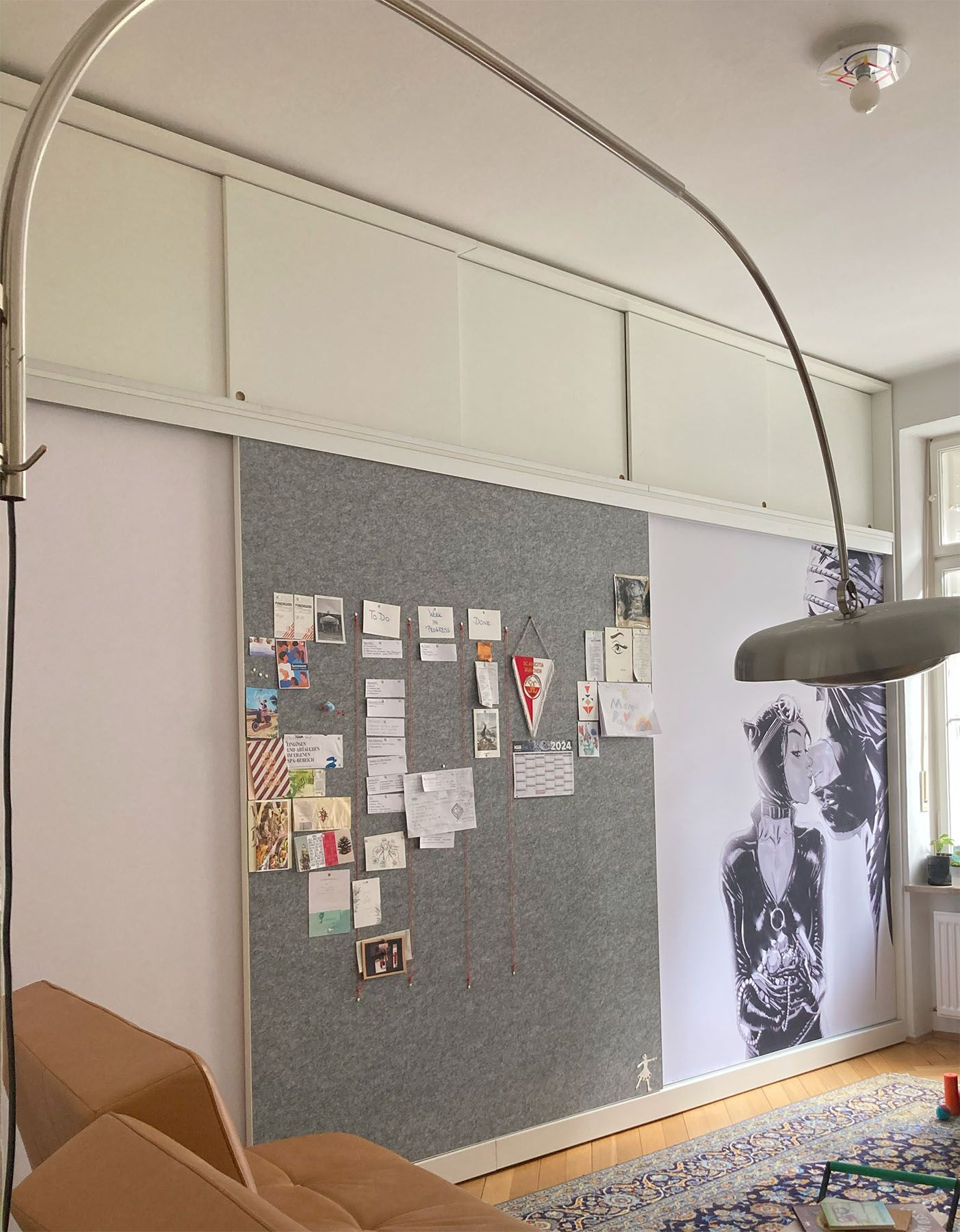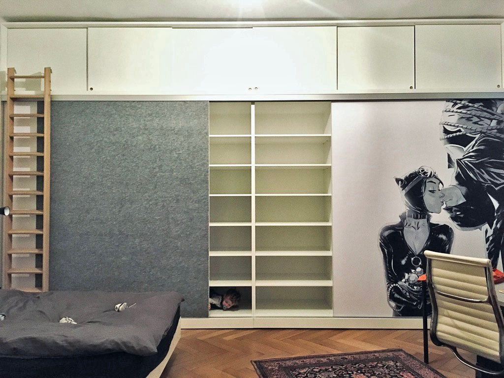 Hinter den Schiebetüren verbergen sich sechs 80 cm tiefe Korpuselemente, die jederzeit auch für sich stehend neu arrangiert werden können. Ebenso die 3 Oberschrank-module, die einzeln beispielsweise als Sideboard genutzt werden können. Die Schiebetüren sind unterschiedlich gestaltet: mit einem weißen Gewebe, das auch als Projektionsfläche für den Beamer dient, mit einem grauen Akustikmaterial versehen sowie mit einer Grafik bedruckt. Das Akustikmaterial ermöglicht einen angenehmen Raumklang und kann gleichzeitig als Pinnwand genutzt werden. Perfekt fürs Homeoffice. Ein Schrank für Alle(s)!